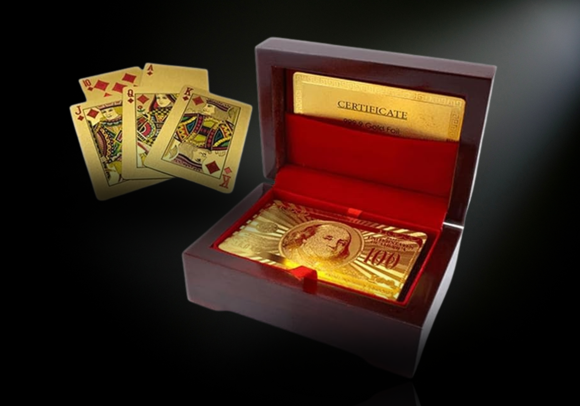 A full 54-card gold foil deck, a wooden gift case, and a gold foil certificate.